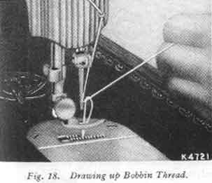 Hold end of needle thread with left hand and turn hand wheel over toward you until needle goes down and up again and thread take-up lever 9, Fig. 20, is at its highest point. Pull up needle thread and bobbin threa will come with it, as shown in Fig. 18.