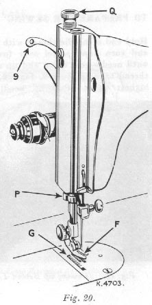To set a light pressure, turn thumb screw Q, Fig. 22, upward until fabric moves easily under presser foot without slipping and without showing feed marks.