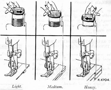 For perfect stitching, the tension on needle and bobbin threads must be heavy enough to pull the threads to the centre of the the thickness of material and make a firm stitch.