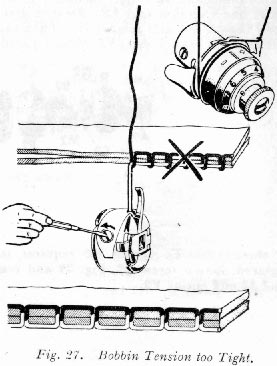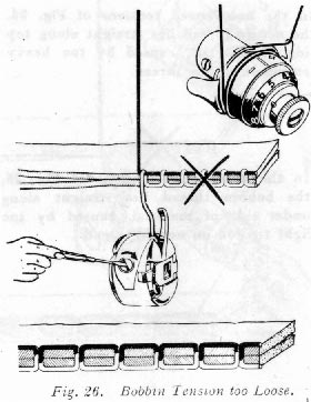 In the unbalanced tensions of Fig. 25, the bobbin thread lies straight along under side of material, caused by too light tension on needle thread.