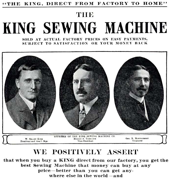 In 1910 they were also known as the King Manufacturing Co. They sold their sewing machines directly to the public. By eliminating dealers and middlemen they were able to offer low prices. They sold machines with no money down and easy payment plans. Customers were also given a free trial and 20 year guarantee.