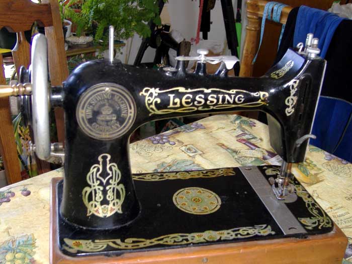 #429785, courtesy of Martha Wickman. This vibrating shuttle machine made by King is badged as Lessing. It has a top leaf tension. The rear inspection plate reads King Sewing Machine Company, Buffalo NY USA. This was 1709 Rano Street, Buffalo, NY, also Main Street, Buffalo, NY.