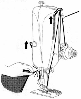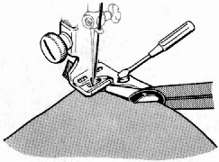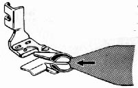8. With take-up lever at its highest position, raise presser-foot, remove fabric by drawing straight back and cut threads with thread cutter as shown.
