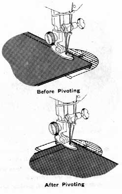 If you wish to stitch a square corner, the guidelines on the throat plate will enable you to make a perfect right angle without measuring. (Each short horizontal line represents the same distance from the needle as the vertical line it crosses.) Suppose, for example, that you wish to make a square corner on a 5/8 inch seam: