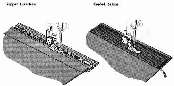 The narrow Zipper Foot makes it easy to place stitching close to a raised edge -- either a zipper or cording. Also, the hinge in the foot makes it ride easily over pins, heavy layers of fabric, or cross seams.