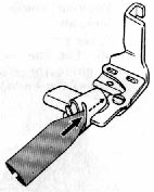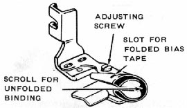 When raised edge is placed to right -- adjust foot to left of needle. When raised edge is placed to left -- adjust foot to right of needle.THE BINDER FOOT