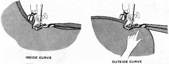Curved edges require slightly different fabrics handling from straight edges. Inside curves should be straightened as they are fed into binder. If fabric is soft and has a tendency to stretch, reinforce edge with a single row of stitching before binding.