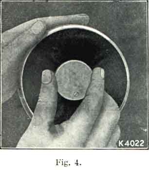 Wheel Stop MotionThis device allows the balance wheel to run free, so that bobbins may be wound without operating the stitching mechanism. To loosen the wheel, hold it with the left hand, and with the right hand hand turn the stop motion screw over towards you, as shown in Fig. 4.