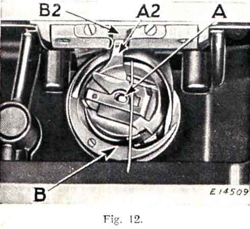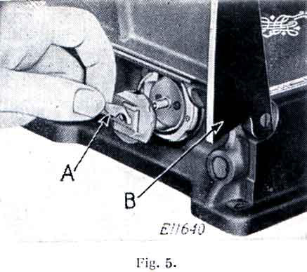Turn the balance wheel towards you until the take-up lever (6, Fig. 14) is at its highest point. Raise the bed extension (B) as far as it will go, and with the thumb and forefinger of the left hand, open the latch (A) and withdraw the bobbin case.