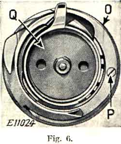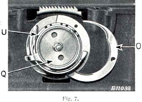 Remove throat plate and take out screw (P) so that the gib (O) can be displaced as shown in Fig. 7. Turn the bobbin case base so that the small point (U) on the base is beneath the point of the sewing hook, as shown in Fig. 7 and take out the bobbin case base (Q). To replace the base, reverse the operation.