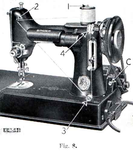 Turn on the electric current, place the right foot on the rest at the right of the foot controller and turn the foot inwards to depress the pedal. This will set the machine in motion, the speed being perfectly controlled by the amount of pressure which should be gradually applied. Operate the machine in this way, without its being threaded, until accustomed to guiding the material and operating the foot contoller.