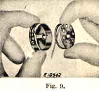 With the left hand hold the bobbin case as shown in Fig. 9, the slot in the edge being at the top, and place the bobbin into the bobbin case.