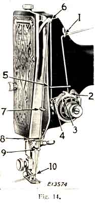 Then pass the thread up and back of the thread guide (5) and from right to left through the hole in the take-up lever (6), down into the guide (8), into the guide (9), and from right to left through the eye of the needle (10), leaving about three inches of thread with which to commence sewing.
