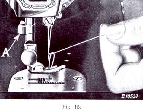Stop the machine with the thread take-up lever (6, Fig. 14) at its highest point and raise the presser foot. Draw the material back and to the left and sever the threads by passing them over the thread cutter (A, Fig 15). Leave the ends of the threads a few inches long under and at the back of the presser foot.