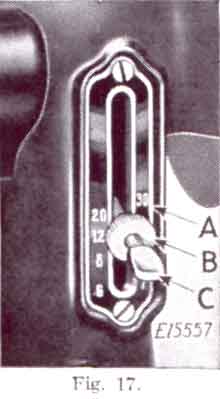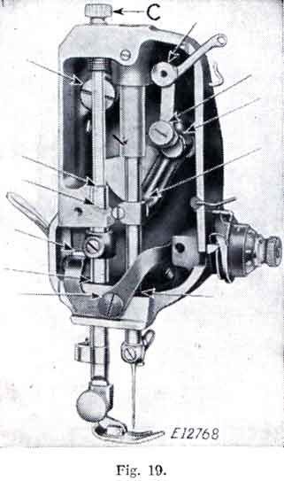For ordinary family sewing it is seldom necessary to change the pressure on the material. If sewing fine silk or flimsy material, lighten the pressure by giving the thumb screw (C, Fig 19) two or three turns upwards. To increase the pressure, give the thumb screw a few turns downwards.