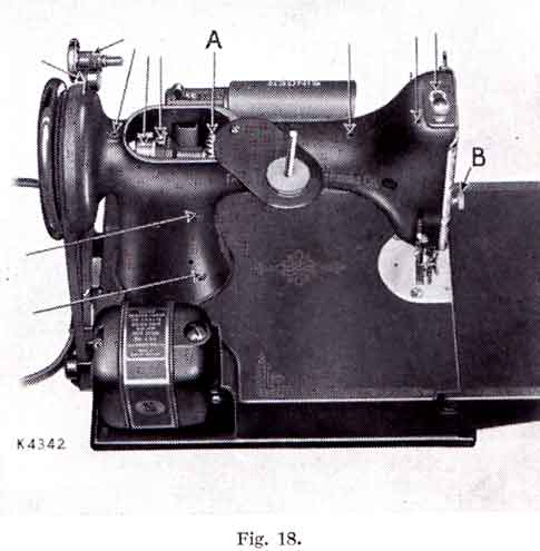 Turn back the cover at the top of the machine and oil the moving parts inside the arm as indicated in Fig. 18, and occasionally apply a small quantity of Singer Motor Lubricant to the teeth of the gear (A), then replace the cover.