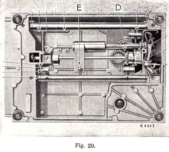 To reach the parts underneath the bed turn the machine over on its side. Remove the thumb nut and felt washer from the screw (E, Fig 20) and take off the cover plate. Apply oil at the holes and bearings indicated in Fig. 20, and occasionally apply a small quantity of Singer Motor Lubricant to the teeth of the gears (D). Replace the bed cover plate, washer and thumb nut, being careful not to fasten the latter too tightly.