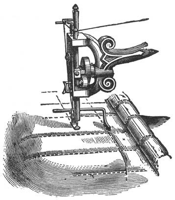 With the braid upon an ordinary reel, straight and even, without twisting; insert the braiding arm through the small hole attached to presser bar; place the reel upon it; pass the end of the braid under the wire bar and through the hole in the presser foot. When sewing, the needle will pass through the centre of the braid; stamp or trace the work to be braided to any design; turn the work as may be necessary to follow the lines (however elaborate) upon shawls, mantles, jackets, slippers, smoking caps, &c., &c.
