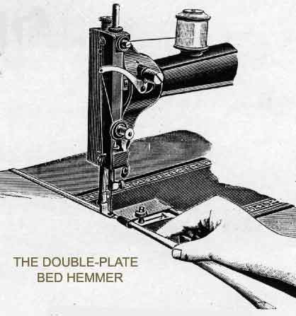 Having thus fixed it for use, take the material in hand, place it in at the front of the hemmer the part to be hemmed, taking care to fill the cone with the material, so that in its passage through to the needle the hem becomes folded, and thus stitched.