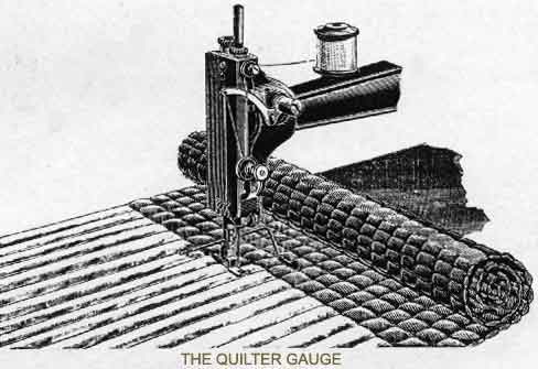 Move the quilter gauge E out from the needle for a wide space and in for a narrow space; after moving it tighten it with the screw behind F in the presser-bar. Very large pieces of quilting should be quilted on the Machine in sections. The quilter is not used except for spacing straight lines of stitching.