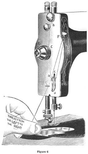 Before threading the machine, turn the hand wheel toward you until the take-up is at the highest point. Place spool of thread on the spool pin. Draw the thread from the spool under the hook and down between the discs "B", passing the thread on side toward you between the discs. Be careful not to wrap it around them. From point "B", carry the thread straight down and once around the tension pulley "C", then down under the auxiliary hook and spring "D & E". Then up through the take-up "F", (threading from the front) down through the thread guide "G". (There is an opening in the guide "G" at left side to allow thread to enter it.) Then through the eye of the needle, threading from left to right.