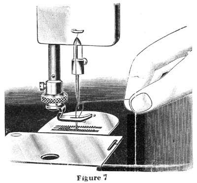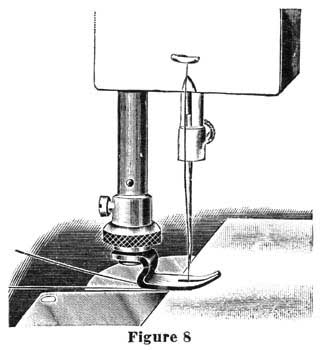 Let the thread extend through the needle two or three inches when the take-up is at its highest point. Now hold this end of the upper thread slackly with the left hand and turn the hand wheel carefully toward you while the needle goes down and raises again to position shown in figure 7 above, bringing the take-up again to its highest point. Then draw the upper thread and the under thread will come up with it, as shown in the illustration. Pass both threads under the presser foot, keeping your foot in the treadle to hold the take-up at its highest position. It is necessary to draw up the under thread before putting cloth under the presser foot and starting to sew, in order to make perfect stitches from the start. |