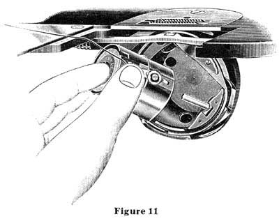 | To remove the spool case, open the spool case cover, as shown in figure 3, (page 3), and with the forefinger, as shown in figure 9, above, swing the top of the spool case outward and grasp it between the thumb and first two fingers, raising it upward out of the machine. Do not remove spool case when needle is down, as this may bend the needle. Be sure that the point of needle is above the needle plate. |