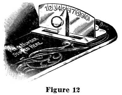 The numbers on the index plate from "1" to "0" indicate long and short stitches. By removing the stitch regulator from you to No. 1, the machine will sew five stitches to the inch, while at No. 0 it will sew thirty-five stitches to the inch. This is a wider range than on any other machine. You may sew any desired length stitch by moving this switch regulator to the point on scale to suit requirements. The regulator automatically locks itself at all points.