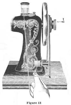 One of the principal features of this machine is the savings of winding bobbins as on other machines. It may happen that you will have only one spool or part of a spool of thread available. In that case, take an empty spool that will fit into the spool case (size 50 spool or smaller) and wind onto it by means of the Automatic Spool Winder, the quantity of thread you may desire to use. Before starting to wind thread, release the hand wheel, by turning the knurled thumb piece (letter "1", figure 13) one half turn toward you. This throws the machine out of gear. Then place full spool on spool pin, as illustrated. Next take the empty spool in the left hand and with the right hand, wrap a few strands of the thread around this spool. Then place spool on the spindle of the spool winder, using care that the thread runs the under side of the spool, as illustrated. Raise the spool winder until the pulley comes in contact with the belt, then start the treadle and proceed to wind spool. If you wish to sew with thread that is coarser than No. 50, you can easily do so by winding the same onto an empty No. 50 spool, following instructions as given above.