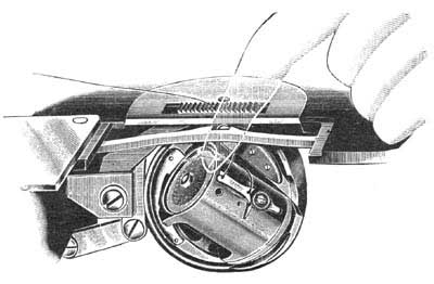 In threading the spool case, take it in the left hand, placing the spool on the spindle (see letter K, figure 10), then drawing the thread as indicated, into the slot (no. 1), over the case and under the tension spring (No. 2). Hold the thread with the thumb, against side of spool case at point between No. 2 and slot (No. 1) then draw it under the end of the tension spring (No. 3). Leave about two inches of thread projecting outside of the case. THE SPOOL CASE LOCK The Spool Case is locked in position in the stationary race by a spring plunger located in the top of the spool case spindle, (see letter K, figure 10). It is possible after long use this spring plunger may wear and fail to snap into place, or to hold the case firmly in proper position. This can be adjusted by pressing down upon the spring plunger with a screw driver, until the screw driver slips into the slot of the hollow screw surrounding the plunger. Then turn this hollow screw to the left about one quarter turn, possibly slightly more or less, depending on how the case fits. By turning this screw to the left, it will raise this spring plunger higher above the head of the spindle. |