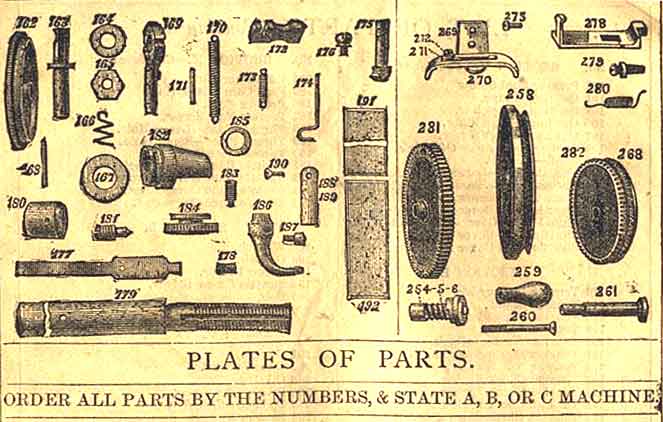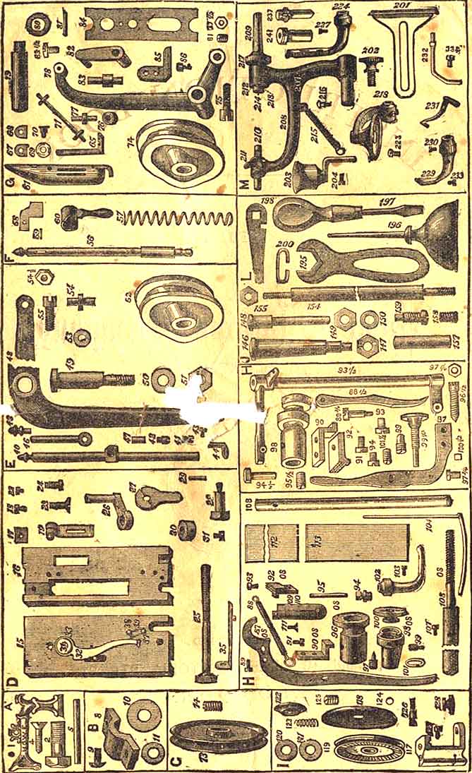 SECTION I (Continued)126 Tension Check Spring Screw Stud127 Tension Set Screw128 Tension Thumb NutSECTION J129 Table Top130 Drawer131 Drawer Slide, or Bolt132 Drawer Slide Screw134 Right Leg135 Left Leg136 Leg Screw137 Leg Brace142 Leg Brace Screw, No. 12, 1/2 inch143 Leg Brace Screw, No. 20, 5/8 inch144 Driving Wheel146 Driving Wheel Stud147 Driving Wheel Stud Nut148 Crank Pin149 Crank Pin Nut150 Crank Pin Washer151 Wheel Guard152 Wheel Guard Screw153 Pitman154 Treadle Rod -- A, B, or C155 Treadle Rod Nut156 Treadle156 1/2 Treadle Cone157 Treadle Pin158 Treadle Pin Screw159 Treadle Screw159 1/2 Treadle Cone Screw160 Dripper -- A, B, or C161 Dripper ScrewSECTION KWHEEL FEED PARTS162 Feed Wheel163 Feed Wheel Stud164 Feed Wheel Stud Washer165 Feed Wheel Nut166 Feed Wheel Stud Spring167 Feed Clutch Lever Washer168 Feed Stud Pin169 Feed Clutch Lever170 Feed Clutch Lever Spring171 Feed Clutch Lever Spring Pin172 Feed Clutch173 Feed Clutch Spring174 Feed Clutch Spring Hook175 Feed Rider176 Feed Rider Screw177 Feed Brake178 Feed Brake Screw179 Shaft -- A, B, or C180 Shaft Collar181 Feed Cam182 Feed Cam Screw184 Feed Cam Nut185 Feed Cam Nut Spring186 Presser Foot187 Presser Foot Screw188 Throat Plate -- Large Hole189 -- Throat Plate -- Small Hole190 Throat Plate Screw191 Shuttle Race Cover -- Back192 Shuttle Race Cover -- Front193 Shuttle Race Cover Rivet194 Shuttle Race Cover PadSECTION L195 Wrench196 Oil Can197 Screw Driver198 Shuttle Screw Driver199 Belt200 Belt HookSECTION M201 Gauge202 Gauge Screw203 Oil Cup204 Oil Cup Set Screw205 Spooler -- Complete208 Spooler Frame209 Spooler Spindle210 Spooler Step211 Spooler Thumb Screw212 Spooler Spindle Washer213 Spooler Spindle Washer Pin214 Spooler Spindle Driving Pin215 Spooler Spring216 Spooler Spring Pin217 Rubber Ring218 Roll Presser219 Roll Presser Arm220 Roll Presser Arm Stud221 Roll Presser Stud Nut222 Roll Presser Wheel223 Roll Presser Set Screw224 Foot Hemmer - Nos 1, 2, or 3225 Bed Plate Hemmer226 Hemmer Tongue227 Hemmer Set Screw228 Braider -- Complete229 Braider Foot230 Braider Foot Screw231 Braider Spring232 Braider Spool Pin233 Braider Spring Screw234 Braider Spool Pin Screw235 Spool Pin Stop235 1/2 Corder -- Complete237 Bed Hinge238 Bed Hinge Rivet239 Bed Hinge Stud240 Bed Hinge Stud Pin241 Bed Hinge Stud RubberCABINET FIXTURES246 Treadle Bracket249 Wheel Guard255 HangerHAND MACHINE258 Hand Wheel259 Handle260 Handle Stud261 Hand Wheel Stud262 Hand Wheel Stud Screw264 Eccentric Nut Pin265 Eccentric Nut Spring266 Eccentric Nut268 Pulley269 Shuttle Carrier270 Shuttle Carrier Spring271 Shuttle Carrier Spring Washer272 Shuttle Carrier Spring Screw273 Shuttle Carrier Screw275 Shuttle Race -- Old Style276 Shuttle Race Screw278 Bed Plate Latch279 Bed Plate Latch Screw280 Bed Plate Latch Spring281 Large Geared Wheel282 Small Geared Wheel |