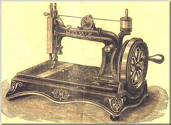 This illustration shows the Howe Hand Machine, with all the latest improvements. The machine as above can be placed on a stand, and the belt can either be put in the groove on the large hand wheel, which gives a very easy motion; or the belt may be put on the small pulley on the shaft, which gives greater speed -- an essential in very light work -- but not quite the same power.