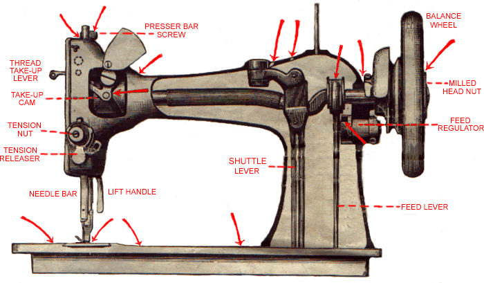 Be sure and Oil the Cotton in the Hole under Front Shuttle-race Slide. The Arrows show where the Machine is to be oiled.