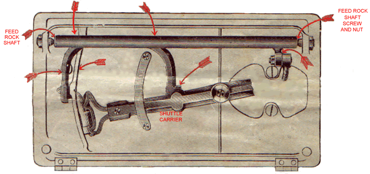 The TWO OIL HOLES marked in Dotted Circles are behind the Head of the Machine, and must be oiled OFTEN whilst Needle Bar is at its highest point. TAKE COVER OFF BACK OF TOP ARM to oil Feed Regulator.