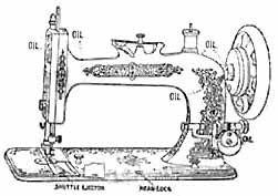 Oil the centers on which the driving wheel of stand turns, and where the foot piece rests on the rod. After the machine has been oiled, run it (with presser-foot up and shuttle out) for a minute, and then wipe off the superfluous oil. If the machine runs hard after standing idle for some time, use a little kerosene oil in the usual way and run rapidly, then wipe clean, and oil with the best prepared oil. Oil the bobbin-winder in places where there is any friction.