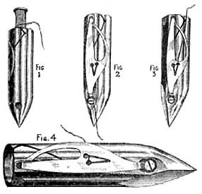 Take the shuttle in the left hand, with the point toward you; draw off about two inches of thread from the bobbin, thread running from the upper side, (se Fig. 1); drop the bobbin into the shuttle as far as it will go; then draw the thread into the open slot of shuttle, at the same time putting a little pressure with the finger on the end of bobbin; by drawing the thread toward you it will be forced under the point of shuttle spring, (see Fig. 2); then draw it back until it passes over the point; (see Fig. 3); shuttle is ready for sewing. Fig. 4 shows shuttle properly threaded, ready for sewing.