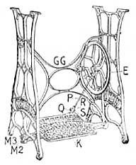 Should the Foot Plate (K) have nay play from right to left it needs adjusting; loosen the Plug Nut (M3) and adjust the Plug (M2) so that the Foot Plate will work evenly, taking care not to set the Plug too tightly against the Foot Plate to cause it to operate hard; if adjusted properly, it should work but with the slightest pressure. Should the Drive Wheel (E) not run true or evenly, loosen the Drive Wheel Crank Plug Screw (GG) and adjust the Plug so the Drive Wheel (E) has no play, but will run evenly, then screw tight. Should the Pitman (P) work too loose on Pitman Stud (Q), loosen nut on lower end of rod and turn the screw slightly to right and tighten nut.
