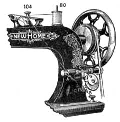 Unlock the balance wheel with thumb and forefinger of the right hand by drawing the key (12) out, turning it part around, (this will save the trouble and annoyance of unthreading the needle and removing the work while the bobbin is being filled). Then swing the bobbin winder until it is in position and presses firmly against the belt. Place the spool of thread to be wound from on the spindle (80) and put the bobbin in the bobbin winder. Pass the thread from the spool, once around the tension screw (104) as shown in cut, thence down between the bobbin winder frame and wire guide at (A), then through slot (B) at bottom of thread guide, then into V shaped slot of thread guide at (C). To secure the end of thread preparatory to winding, place it between the head of the bobbin and its socket at the right hand. Proceed as in sewing. When the bobbin has been filled, swing the winder from belt and turn back the key (12) until it enters the hole and locks the balance wheel.