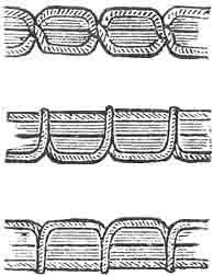 No. 7. --- PERFECT STITCHING. - This will result when the upper and under threads evenly balance each other (tight enough to lay the threads smoothly yet not so tight as to pucker the cloth), the thread being locked in the centre of the goods, thus,