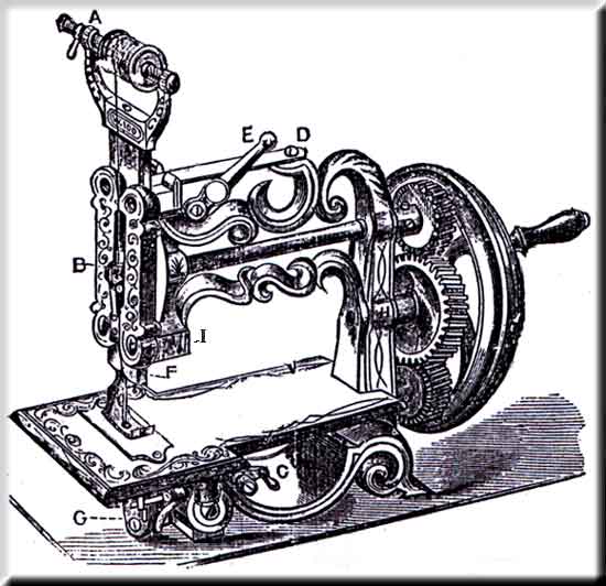 Push the lever E (see cut) towards the spool till it stands up straight, put under the work and push back the lever, letting down the presser. Put the thread through the eye in the front plate: thread the needle through the front, wind the thread once round the cramp post B in the needle bar, bringing it to where it is double on the side next to the cramping roll, and the machine is ready for operation.