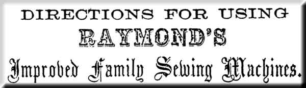 Through the great success which the genuine Raymond's Machine has achieved, numerous worthless imitations are now offered, against which purchasers are cautioned. No Machine is genuine unless stamped with the nam: CHS. RAYMOND and date of U.S. patent on the needle plate.