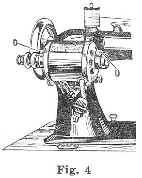 To wind bobbins, raise the spooler to its highest point where it is locked in position, as shown in Fig.3. Connect spooler pulley and motor pulley with spring belt, as shown in Fig.3. Take the bobbin in left hand and the thread in the right. Place the left hand center of the bobbin in the little depression for it in the end of the spooler spindle, and by pressing to the left the spindle will move back and allow the head of the bobbin to enter the friction cavity or cup at the right hand. As it enters this cavity see that the end of the thread goes with it, and that it is held in the cup by the pressure of the bobbin head. This will hold the thread securely when the winder starts. Unless this is done, it will be necessary to wrap the thread several times around the shank of the bobbin or else tie it, in order to get it started. Draw the thread in the notch at the top of the distributing bar, then down under the notch at the lower end of the distributing bar. Loosen the hand wheel by turning milled edge hand nut on right end of shaft to the left (top toward you) one-half turn, this will permit the operation of the wheel and bobbin winder while the working parts of the machine stand still.