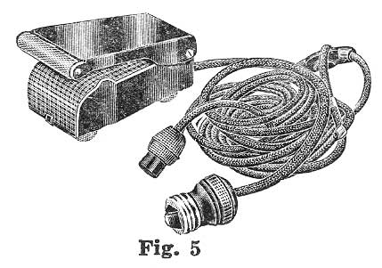 Attach screw plug at end of the long cord, as seen in Fig. 5, to any electric light socket. The short wire makes the motor connection. Place the foot control on the floor and press lightly, this will start the wheel moving slowly, pressing a little harder will make it run faster.