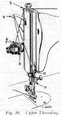 Turn the hand wheel toward you until take-up lever 9, Fig. 10, is at its highest point. Withdraw the bed slide plate. Reach down with the left hand and open bobbin case latch K, Fig. 11. Lift out bobbin case. Release catch and remove bobbin from bobbin case.