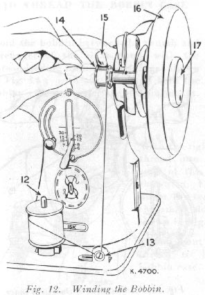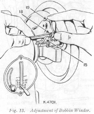 If pressure of bobbin winder pulley against hub of hand wheel is insufficient for winding the bobbin, press down bobbin winder until latch 15, Fig. 13 drops and holds its position.