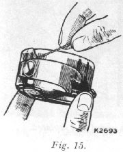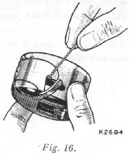 With the right hand draw the thread into the slot in the edge of the bobbin case, as shown in Fig. 15 and back under the tension spring into the small slot at its end , as shown in Fig.16.