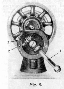 When the machine is uncovered, the hand attachment will be found to be out of working position as shown in Fig. 6. Pull the small spring stud 2, and turn the handle back until the lever 1, enters the socket 3. Press back the hinged finger 4, Fig. 7 between the spokes of the wheel. The machine is now ready for working, as shown in Fig.7.