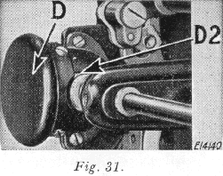 The gears concealed by the gear cover (E2, Fig 30) are oiled through the oil hole (E, Fig 27). The gears concealed by gear cover (D, Fig 30) are oiled through the space just above the cover, as indicated by arrow (D2, Fig 31).