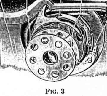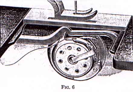 Remove the bed slide (front), have the point of the hook toward you, as shown in Fig. 2, with the ball of he thumb (not necessary to use the finger or the thumb nail), open the latch until it stands out straight, then brush the bobbin outward, until it hangs on the latch, for removal (see Fig 3).The inside of the bobbin case should be wiped out occasionally with an oiled rag to remove lint or dirt.