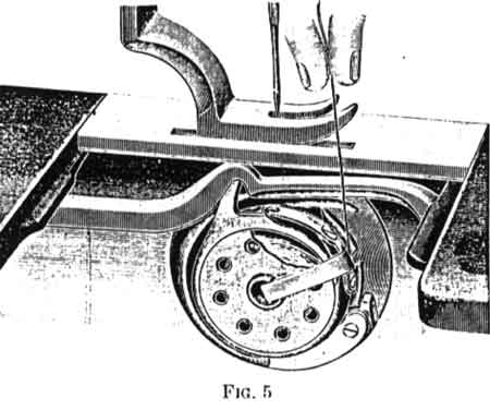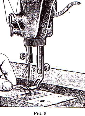Let the thread extend through the needle two or three inches when the take-up lever is at its highest position. Hold the end of the upper thread slack and turn the balance wheel carefully from you while the needle goes down and up, and the point down to the presser foot (see Fig 7), bringing the take-up lever to its highest position. Keep your feet on the treadle, as foot pressure on the treadle holds the take-up lever at its highest position, then draw the upper thread and the under thread will come up with it (see Fig 8). Pass both threads back under the presser foot (see Fig 9).